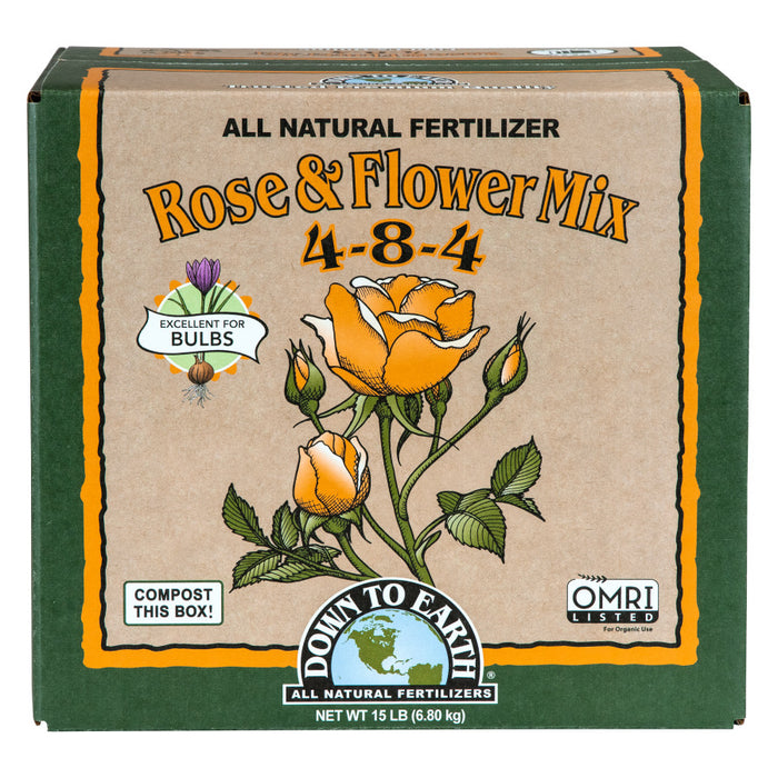 Down To Earth™ Rose & Flower Mix is outstanding for all types of roses, bulbs, flowering shrubs and even onions and garlic. Apply when planting new roses, bulbs and perennials and use throughout the season when new growth appears on existing plants.