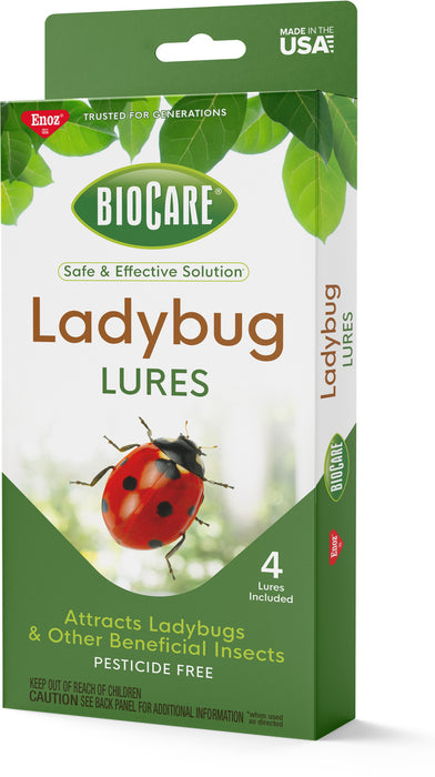 The BioCare® Ladybug Lures contain a pheromone which acts like a magnet that tells beneficial insects, such as ladybugs, where to find food. Use Ladybug Lures with live ladybugs to keep them in your garden longer. Each package contains four lures. Replace lures every 3 to 4 weeks. Helpful hint: Place the lures whenever aphid infestations are seen. Use 1 lure every 6 feet through your garden or green house. Contains 4 lures. Made in USA.