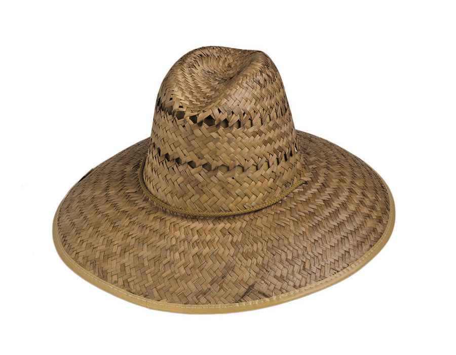 100% Straw Lifeguard Hat with a 5.00" brim for sun protection, adjustable chin tie, crown ventilation in weave, and an elastic stretch band for fit and added comfort.