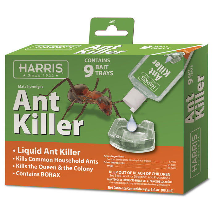 Harris Ant Killer is a ready to use Borax formula and contains 9 flat cardboard bait trays and liquid bait. Simply pour a drop onto each bait station and set several in place. The bait will attract the ants that end up carrying the bait back to the colony and kill the queen and colony. Kills many different species of ants and is safe for residential use.