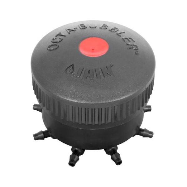 Octa-Bubbler® is a pressure compensating device with a 1/2 inch FPT inlet and 8 swivel port 3/16 inch outlets. Constructed using ABS plastic. Built in back flow prevention engineered for added protection. Octa-Bubblers deliver water to multiple locations. Optional port plugs are available for unused ports. Each Octa-Bubbler® has a 150 mesh filter screen for clog resistance. Interchangeable color coded flow control gives you the ability to change your GPH without changing the bubbler. Available flow rates are 2 GPH, 6 GPH and 10 GPH, 20 GPH using a flow control device. Pressure compensation range is 20 – 60 psi.