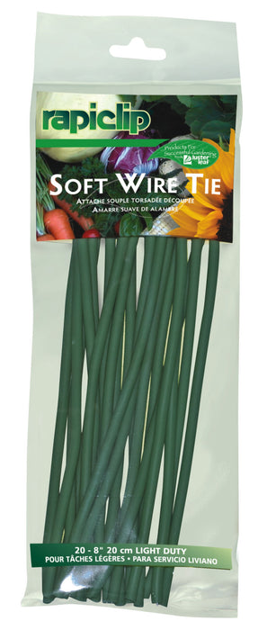 Rapiclip light duty, pre-cut 8 inch plant ties are offered 20 per bag. The ties are formed from a 5 millimeter multipurpose green PVC/TPR (polyvinyl chloride/thermoplastic rubber) cushioned 0.8 millimeter galvanized wire.