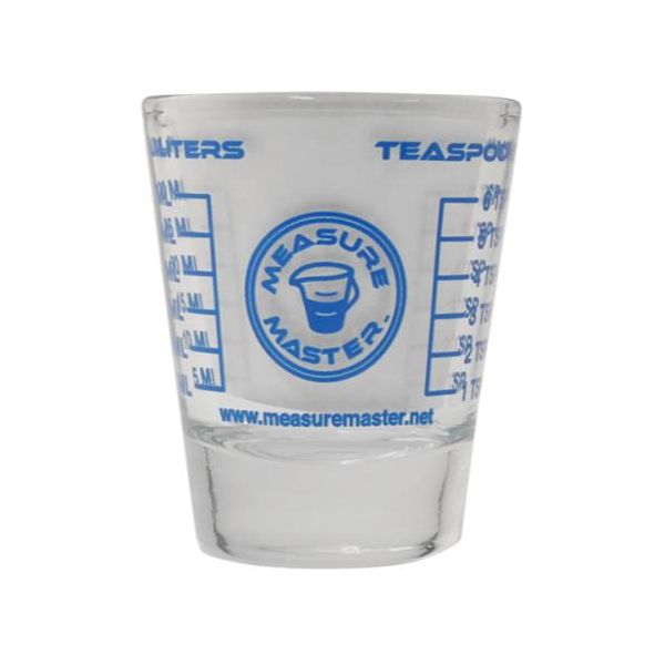 General purpose measuring shot glass. Graduation measurements include teaspoon, tablespoon, ounces and milliliters. Clear glass for easy and accurate measuring. Glass printed in the USA using baked on specialty ink. Packed in display box.