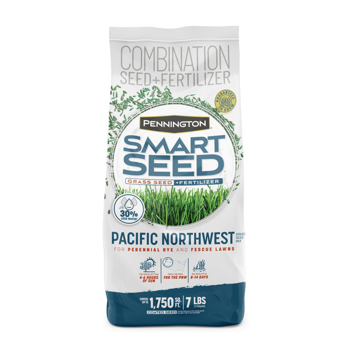 In the Pacific Northwest, your lawn must withstand cool, wet weather all year. Pennington Smart Seed Pacific Northwest Mix consists of a premium mix of Perennial Ryegrass and Fine Fescues that are specifically designed to flourish in this climate. Smart Seed Pacific Northwest grass seed mix is disease resistant and drought tolerant and contains just the right amount of fertilizer to help your lawn succeed. In areas of your lawn that receive 4 to 6 hours of sun daily, plant this grass seed mix in the early spring or early fall and see results in 8 to 14 days. This 7-pound bag covers up to 1,750 square feet for overseeding an existing lawn and 580 square feet for starting a new lawn from scratch.
