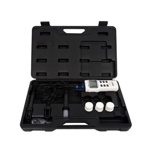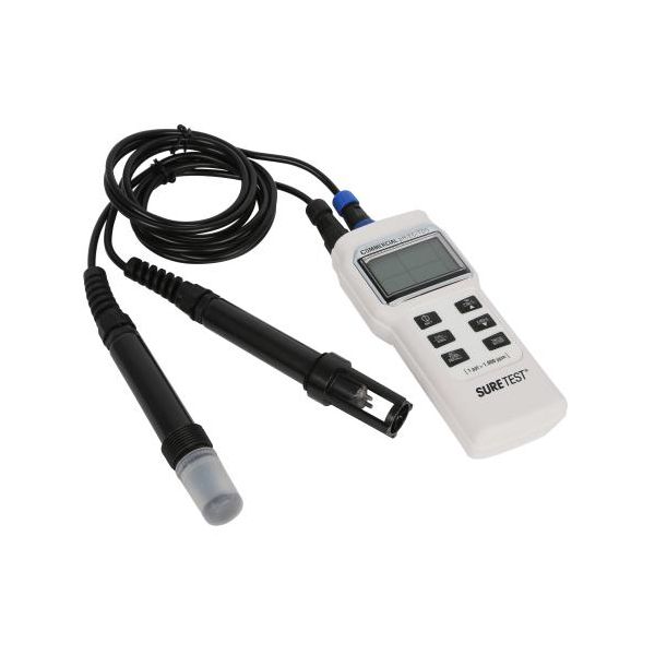 The Sure Test® Commercial Multi-Meter allows for easy measurement of pH and conductivity (EC or TDS) and temperature (F° or C°) in one versatile unit. It also has the ability to measure dissolved oxygen (DO) with the optional DO probe (716388 - sold separately) making it the most versatile handheld multi-meter available. This rugged meter includes automatic temperature compensation (ATC) for more precise pH readings. Easy to use and calibrate, this meter is an excellent choice for all in one nutrient management anywhere you take it. Comes with replaceable conductivity probe (716382), replaceable pH probe (716386), hard carrying/storage case and 6x AAA batteries. Waterproof housing (IP65 rated).