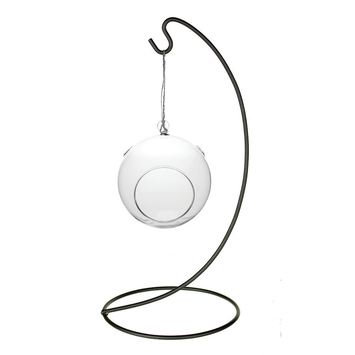 The Syndicate Round Hanging Terrarium w/Wire Stand can be used with candlelight for added drama. Constructed with solid seams for no leaks. Unique cantilever stand silhouette adds height.