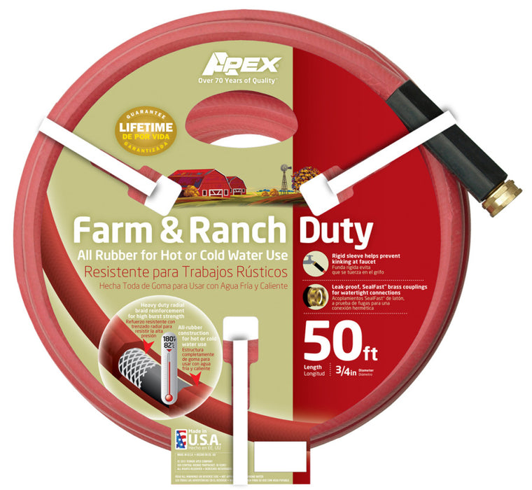 Teknor Apex Farm & Ranch dutyall rubber hose can be used for hot (180 degrees F) or cold water use. Heavy duty radial braid reinforcement for high burst strength. Rigid sleeve stops kinking at the faucet. Leak-proof SealFast™ brass couplings for watertight connections. Flexible rubber construction for easy cold weather handling. Lifetime Guarantee. Made in the USA