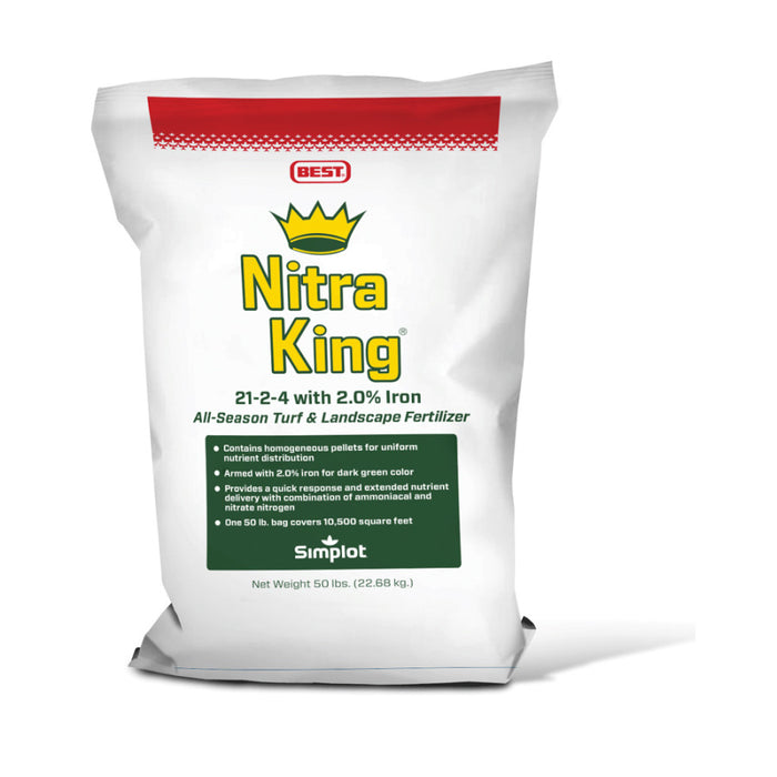 A New All Season Fertilizer with 4.4% Nitrate Nitrogen for quick green-up. Made with our new F?SN technology, Nitra King provides a great nitrate and ammoniacal nitrogen ratio for your plant. The 2% iron is from a Simplot homogeneous pellet which virtually eliminates the possibility of staining sidewalks, etc. You'll see the difference with your first application!