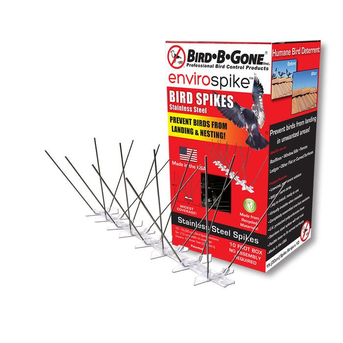 Keep pigeons, seagulls, or larger birds from landing and roosting in unwanted areas with Bird B Gone Enviro Spike® Stainless Steel Bird Spikes! Bird spikes are an effective, humane and cost-effective bird control solution that will not harm birds. Bird B Gone Enviro Spike® Stainless Steel Bird Spikes are ready to use and easy to install. No assembly required. Each bird spike strip comes pre-assembled in one foot sections, can be glued, screwed, or tied down to most surfaces and can easily be cut down into smaller lengths if needed. Virtually invisible, bird spikes are ideal for use on ledges, rooflines, parapet walls, eaves, I-beams, windowsills, light posts, signs, and more. The patented Enviro Spike® Stainless Steel Bird Spikes design is made from high-quality stainless steel that will not rust or deteriorate under extreme conditions. The U.V. protected polycarbonate bird spike base is flexible, can bend 360°, and will fit flat and curved surfaces. Each 10 ft. box offers 10 true feet of coverage and is recommended for a ledge size of 5" to 7". Wider ledges may require multiple rows.