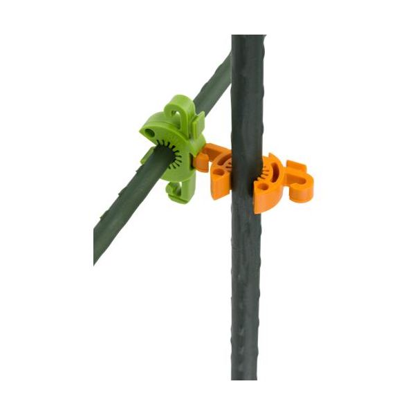 Use C-Bites to anchor tie lines, netting and connect stakes together for strong plant supports of almost any size and configuration! Connect C-Bites together by inserting grooved hook or foot (located on smooth hook) into slot on another C-Bite. Use hooks and holes to secure cords or ties. Snap on clips securely anchor ties, netting and more to garden stakes. C-Bites are manufactured in the USA from UV resistant non-virgin plastic. They are made in two sizes that fit most commonly available garden stakes & canes. The #9 best fit the skinny 8 mm & 9 mm plastic coated stakes (Grower's Edge® 2, 3 & 4 ft). The #10 C-Bites best fit the 10 mm & 11 mm stakes (Grower's Edge® 5 & 6 ft).