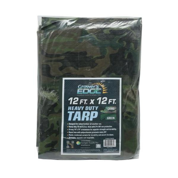 Grower's Edge Heavy Duty Tarps are designed for indoor/outdoor all-weather use. Heavy duty 10 mil/5.5 oz. thickness. The Grower's Edge Tarps feature a 2% UVI sun protection treatment and strong 14 x 14 inch cross weaves for superior strength and durability. These tarps come with green camo pattern on the top and solid green on the back. Roped hem and polycarbonate grommets at 3 ft intervals all around the outside edges with plastic reinforced corners for easy tie-down. Every tarp is washable, reusable and recyclable.