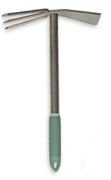 Three sturdy prongs allow deep tilling and cultivating. Sharpened blade for easy cutting. Steel handle.