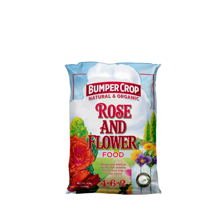 Master Nursery® Bumper Crop®Our Bumper Crop Natural & Organic Rose & Flower Food is a blend of natural ingredients designed to encourage sturdy growth and flowering in roses, perennials and other flowering plants and acceptable for use in organic production.