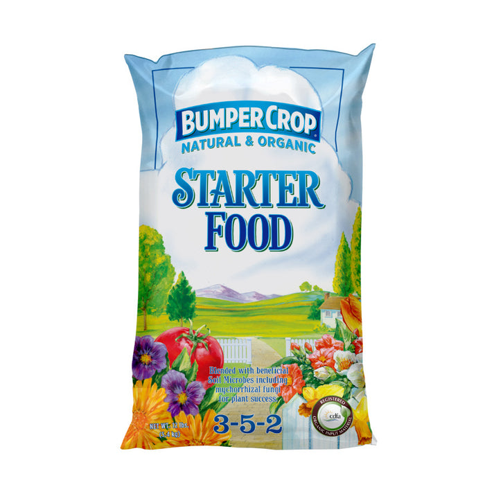 Master Nursery® Bumper Crop® Natural & Organic Starter Food is a blend of natural ingredients formulated to help newly transplanted plants develop strong roots and sturdy growth. It is rich in natural sources of phosphate to help your plants develop a strong foundation for future growth. Our gentle and non-burning formula is safe to use with even the most tender transplants.