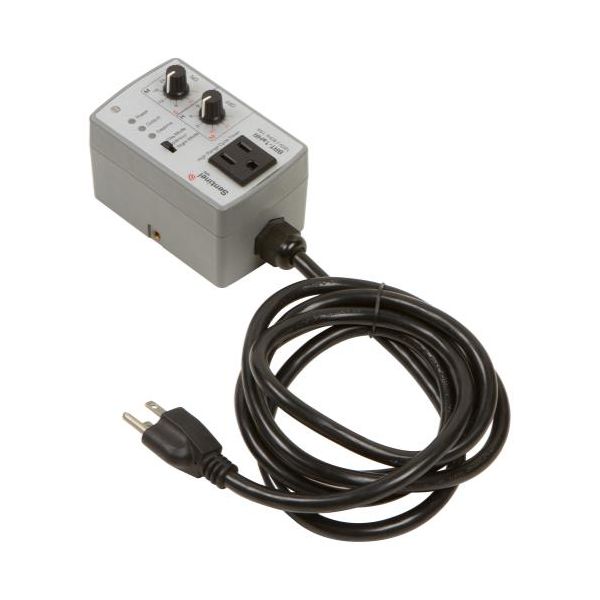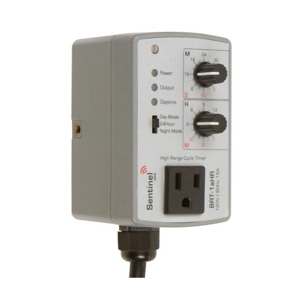 The BRT-1aHR Basic Recycle Timer - High Range is designed to control equipment that has to be turned On and Off at precise, repeated intervals. Hydroponics, drip irrigation, aeroponics, CO2 injection - these are just many of the tasks the BRT-1a can control. The BRT-1a features a readily visible switch to alternate between day or night or continuous operation making it easy for the end user to differentiate which mode it is operating in. Easy-to-read dials make programming On and Off time settings uncomplicated. The (3) function LEDs let users know if the timer has main power, if the timer is in operation, as well as whether the timer is sensing day or night.