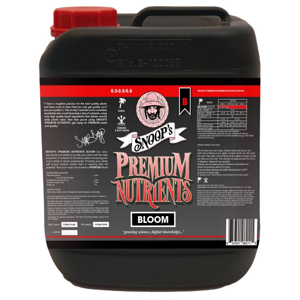 Our coco nutrients have been formulated so that you achieve premium results from your coco substrate. The recipe is tailor made taking into consideration the elements already present in the background EC of the coco due to the buffering process coco goes through. Most coco buffering use potassium nitrate. To correct this potassium is reduced and calcium is increased in the recipe. Our non-circulating nutrients have been formulated so that you achieve premium results from your run to waste system. The recipe is tailor made taking into consideration the fact that the nutrients pass through the root zone only once. When this happens the exact ratio of each element they require is delivered. To reach their full potential, flowering plants require more cations than anions. Snoop’s Premium Nutrients Bloom A&B has been specifically formulated to provide your plants with the ideal proportion of nutrients for the bloom phase increasing your crop’s ability to bloom productively. Providing your plants with proper nutrition assists them in reaching their full potential. Now your crops can achieve a Premium Bloom.