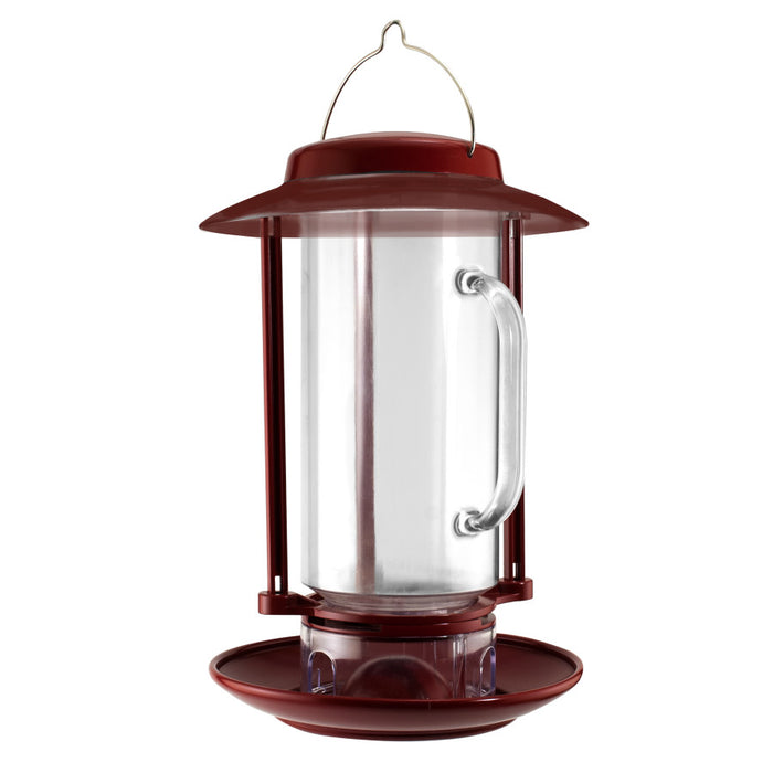 It's a scoop and feeder in one! Combination feed and seed scoop hopper feeder is the ultimate in convenience. To fill just turn handle to right to remove hopper, scoop up the seed, replace hopper in feeder and turn handle to left. Seed will automatically drop into the seed tray! The design lets you easily view the seed level for quick and easy replenishing. Sturdy plastic construction with clear view roof to keep seed dry. Holds approx. 2.5 lb. of seed and is best used with standard seed mixes or black oil sunflower seed. Install in an area that allows for easy viewing access and hang about 5 -1/2 ft. high for easy filling. Clean periodically with soap and water and rinse well. Birds attracted to this feeder are woodpeckers, chickadees, nuthatches, bluebirds, and others.