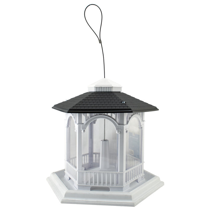 Delightful garden accent! This realistic garden Gazebo attracts a wide variety of songbirds. Easy to fill lift up top holds up to 10 lbs. of mixed seed and needs less refilling. Comes fully assembled and ready to hang. Hanging wire included.